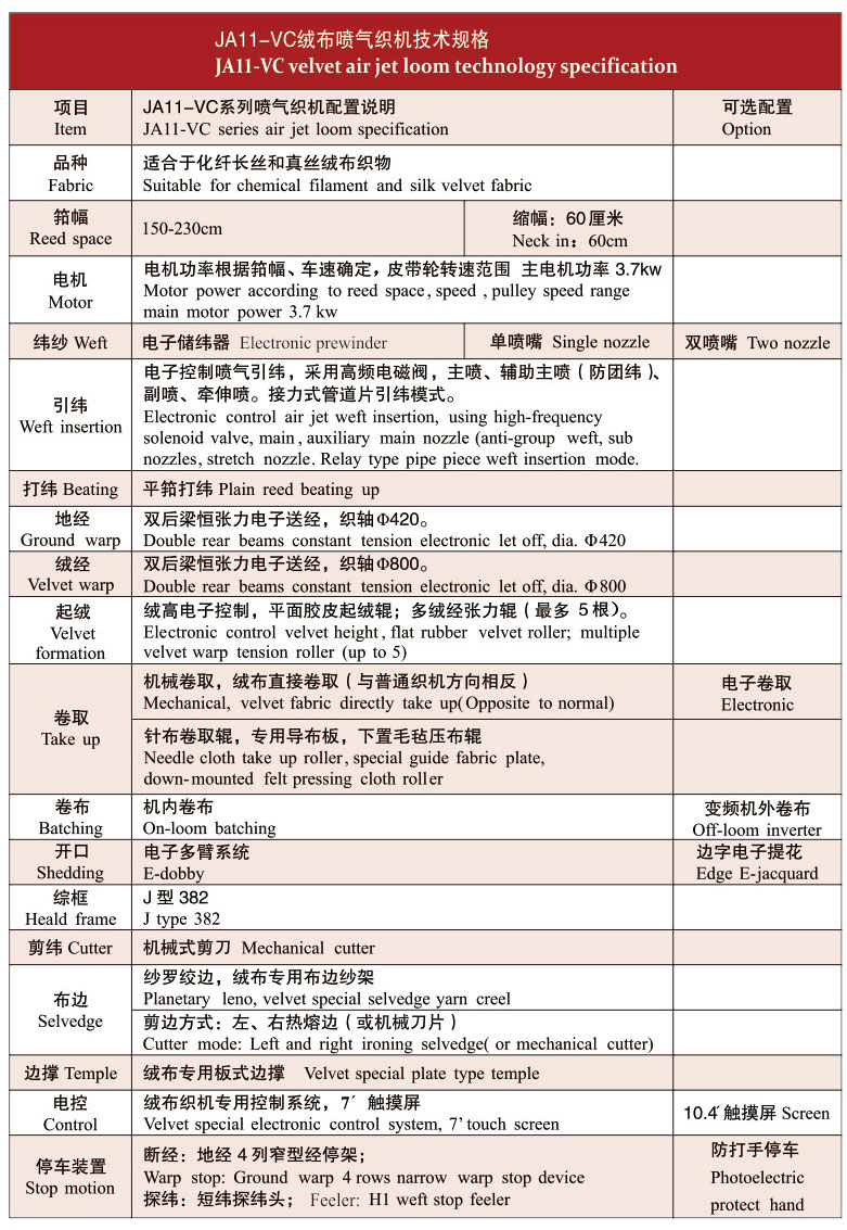 JA11-VC絨布專用高檔噴氣織機(jī)是青島天一集團(tuán)紅旗紡織機(jī)械有限公司經(jīng)過多年研發(fā)專用于絨布織造的一種特種噴氣織機(jī),經(jīng)過用戶使用,在開機(jī)效率、運(yùn)轉(zhuǎn)速度、織造質(zhì)量、智能操作等方面都達(dá)到較為理想的效果,是絨布織造行業(yè)更新?lián)Q代的理想產(chǎn)品。