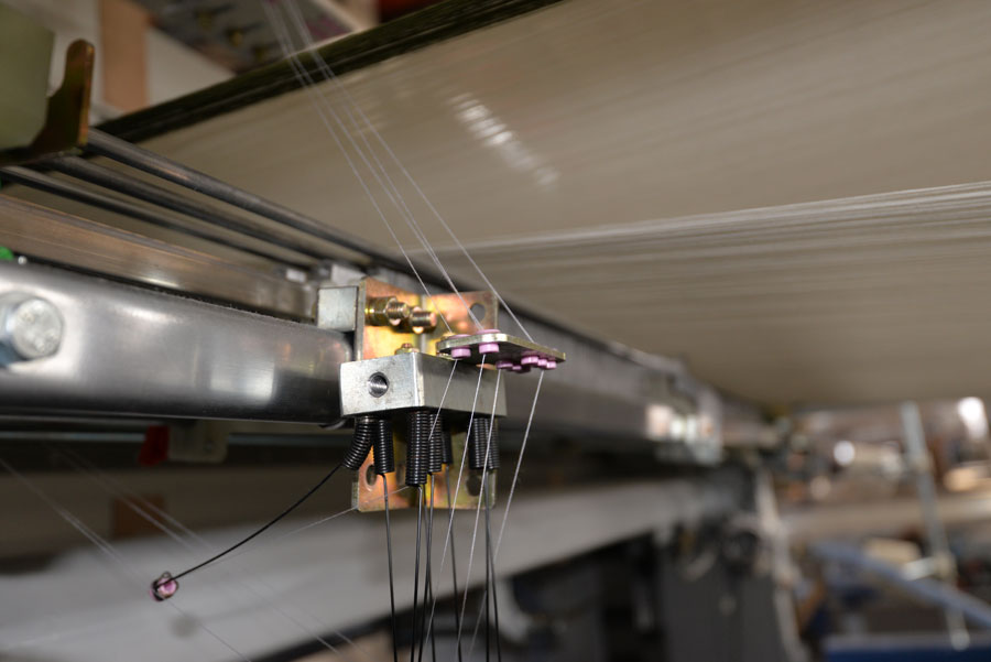該產(chǎn)品可以織造經(jīng)起絨絨布組織要求的雙層布織物,上下兩層之間有一定高度的絨經(jīng),后經(jīng)過割絨機(jī)將其割開形成兩塊絨布。該產(chǎn)品采用智能化絨布噴氣織機(jī)專用控制系統(tǒng),可以實(shí)現(xiàn)電子送經(jīng)(地經(jīng)、絨經(jīng)分別控制)、電子控制起絨、電子多臂開口、電子控制管道片式噴氣引緯等功能,在織造過程中可以保持張力穩(wěn)定、絨高織造控制精確,采用噴氣式引緯方式不會與經(jīng)紗邊紗摩擦產(chǎn)生毛板,管道片接力引緯更能夠提高引為效率和降低能耗。